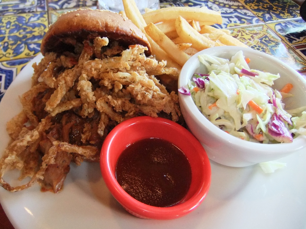 ポークサンドは、BBQソースで柔らかくグリルされた豚肉の上に、たっぷりのフライドオニオンが乗っています。