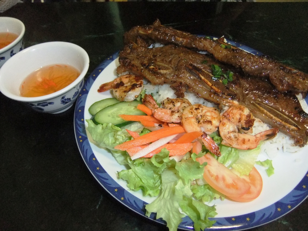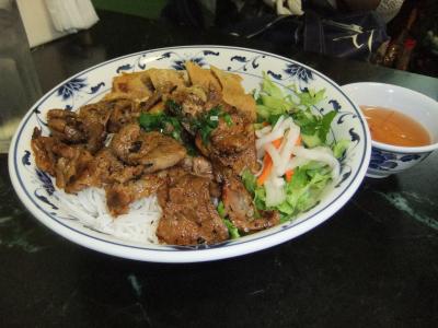 焼いた豚肉・春巻き・野菜がのった麺に、スイートチリ(ほとんど辛くはありません)のようなものをかけていただく一品が、日本では味わえない意外な美味しさでビックリでした。