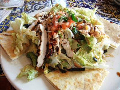 サラダにはローストされたチキンが乗り、ケサディーヤ(チーズをトルティーヤで包んだもの)が添えられています。タコスを細切りにしたような材料も入っていて、ドレッシングもメキシカンな味わいがします。