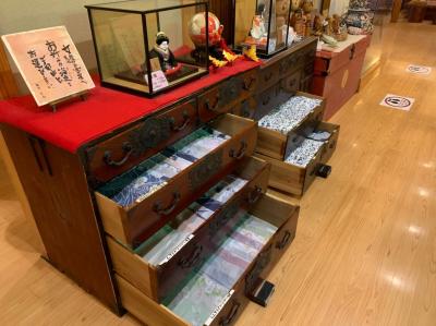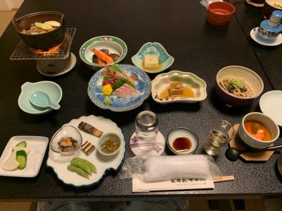 食事は広間で間隔を開けて席が用意されていて、和牛と牛タンの陶板焼きが美味しく、名物の岩魚のまぼろし漬けが頭から尻尾まで食べられ絶品でした。