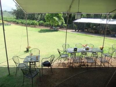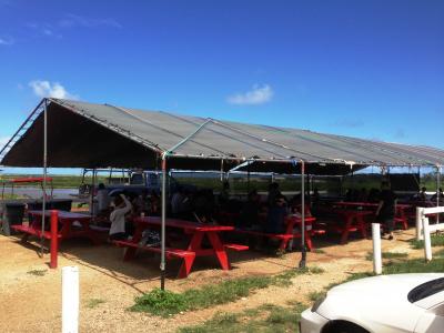 屋根の付いたテーブルがあり、日差しやスコールの心配はいりません。