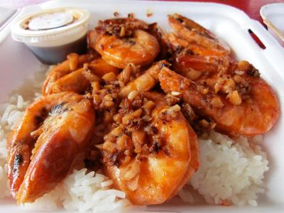 ガーリックの効いたカフクシュリンプは、ぷっくり大きく目で、ライスに良く合います