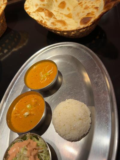 2種類のカレー(チキンとシーフード)とナン、サフランライスを注文。