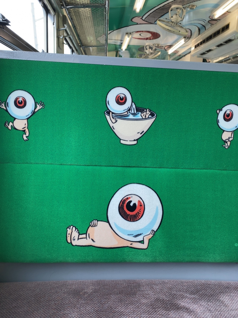 飛行機を降りたところから、ゲゲゲの鬼太郎のキャラクターがあちこちに…