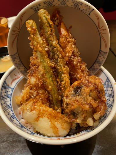 そびえ立つ、エビと野菜がたっぷりでボリュームがすごい、衣もカリカリして美味しい。