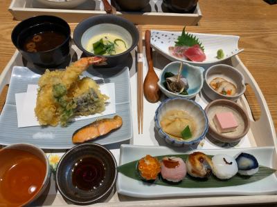 手毬ずし、天ぷら、お刺身、茶碗蒸し、などなど、少しずつ色々食べられるのが、すごくいいです。