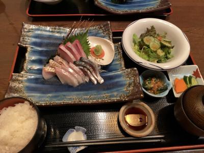 鯛、カンパチ、スズキ、シメサバの4種におしんこ、サラダで、1200円。