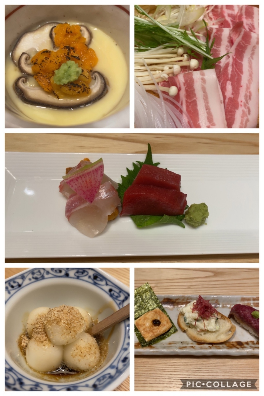 前菜、お刺身、茶わん蒸し、豚しゃぶ、全部にうにが付いてきます。