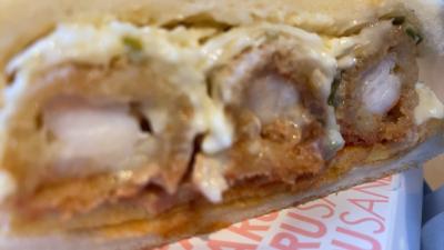 有名なエビフライサンド、大きなエビフライ3本は注文してから揚げてくれました、薄焼き卵と千切りキャベツ、カツソースとタルタルソースで味付けしてあります。