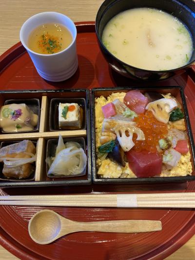 お料理は二段のお重で一段目はチラシ、二段目は9つに区切られていて