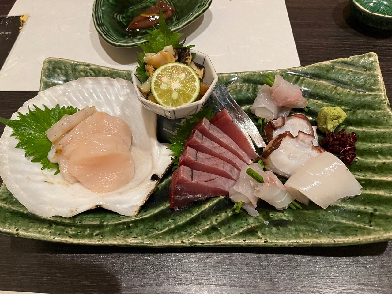 カニすき、焼きカニ、天ぷら、新鮮なお刺身、ほたるいかもありました。
