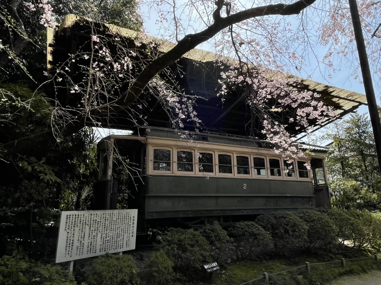 はいってすぐの桜の山を過ぎ、平安の苑のエリアの奥になんともレトロな電車がおいてあっておどろきました。