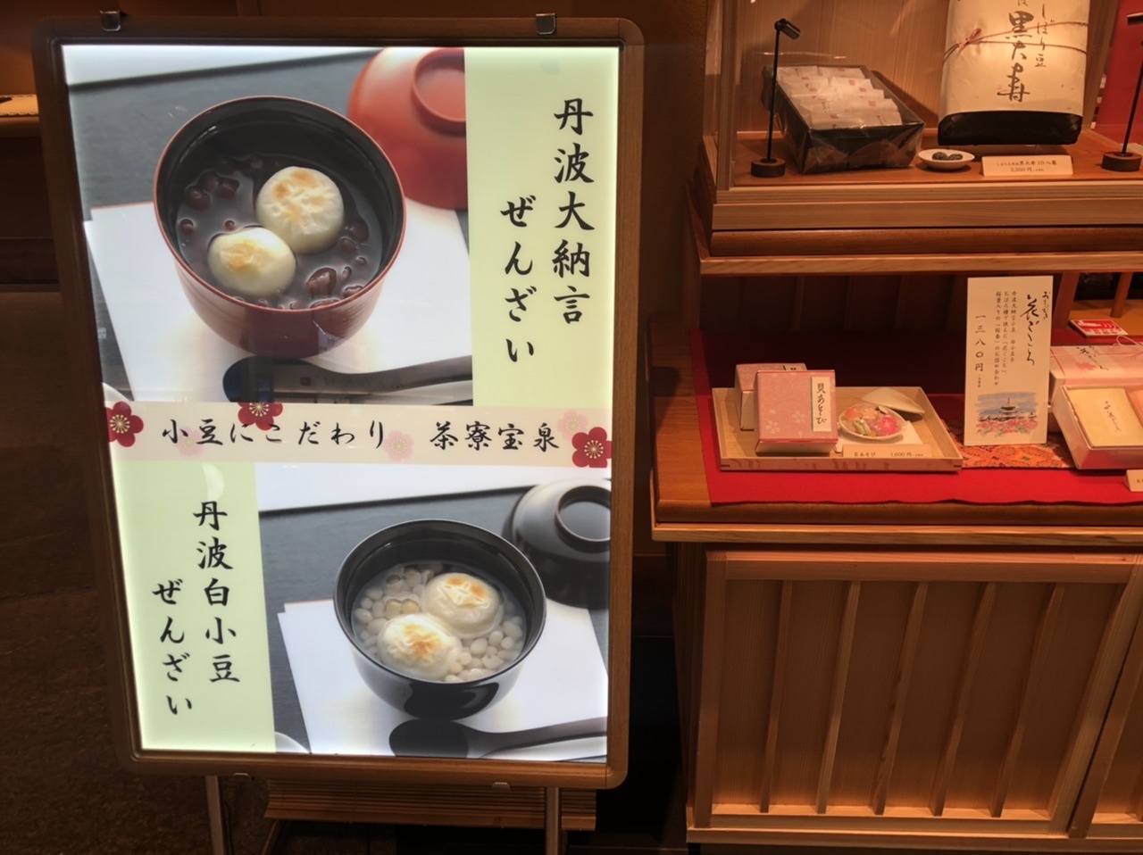 今は同じ広場の「松葉」はリニューアル工事中ですので、なにかちょっと腹ごしらえをしたい場合はここが一番です。寒い時期、あたたかいぜんざいが嬉しい。白いお豆さんのぜんざいがあるのが京都らしいですね。