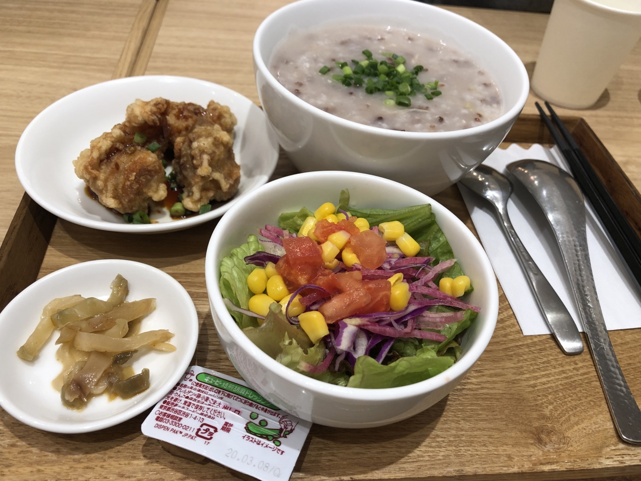 おかゆのセットに鶏唐をプラス。サラダがけっこうしっかりしていて嬉しいです。- 旅行時期