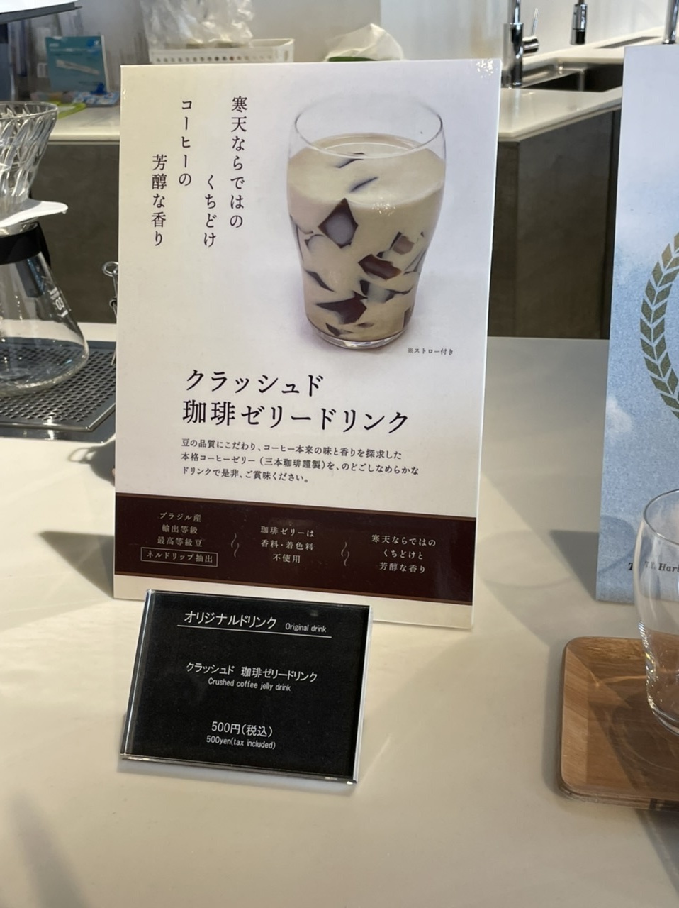 入口に有料メニューで「クラッシュドゼリードリンク 寒天ならではのくちどけ」という案内がありとても美味しそうでした。もっと時間がある時なら、頼んでみようかなと思いました。- 旅行時期