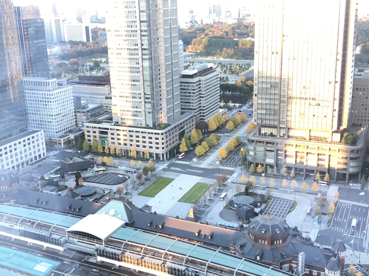 東京駅の周辺は、長いことあちらを工事、こちらを工事で柵に阻まれあまり全体像を見れなかった気がします。ようやく全ての壁が取り払われて、イチョウの紅葉の美しい駅前の広場を見ることができました。宿泊先のホテルの窓からは、駅前の全体像もよく見えました。