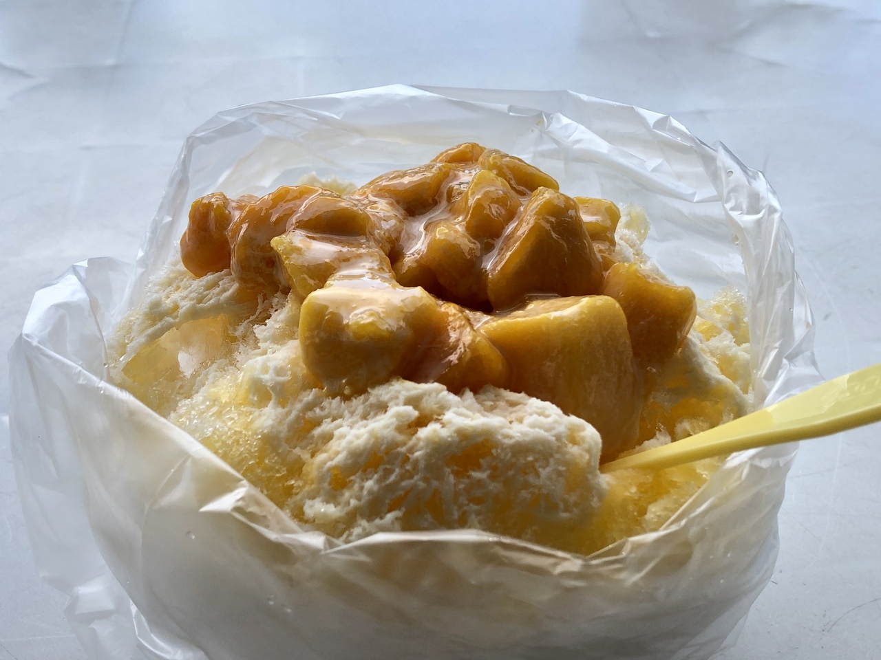 どうやら、マンゴーのパフェとかき氷のセットは休止中だったようえちょっと残念でしたが、マンゴーのかき氷をオーダー。コロナ対策で店内飲食はNG、外に少しだけ席があって、そちらでいただきました。
