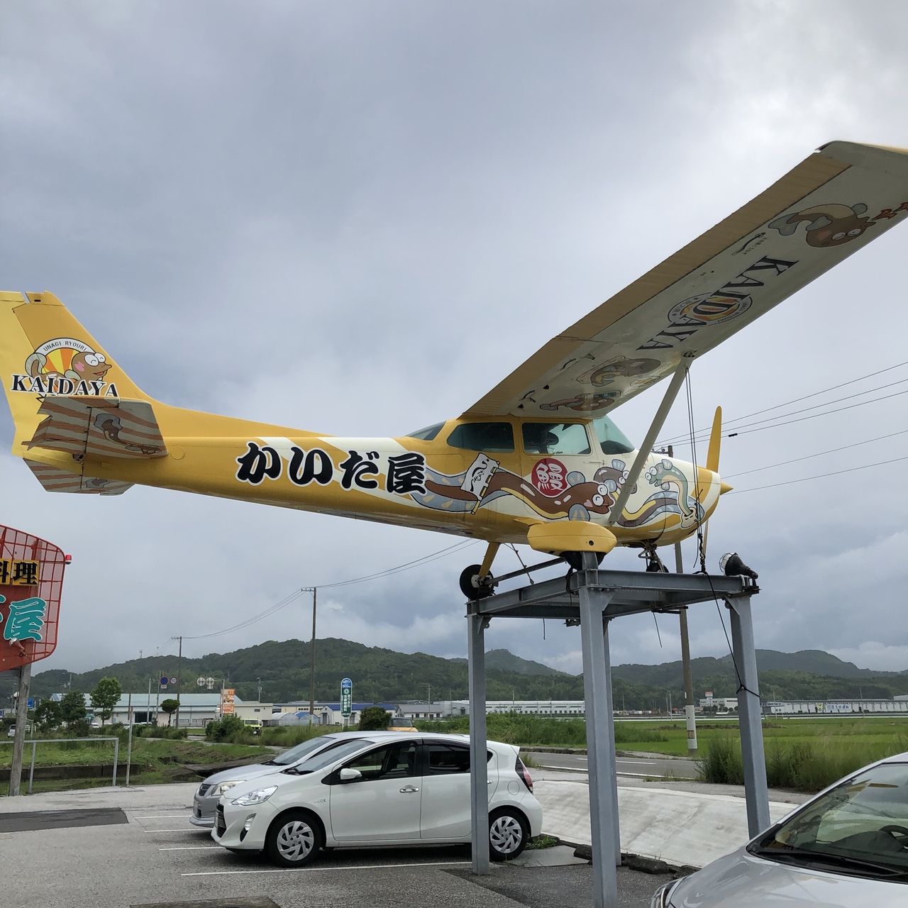 入り口の前に黄色いセスナ機が乗ったやぐらが立っています。セスナ機に「かいだ屋」と書いてあるのですぐに分かります。