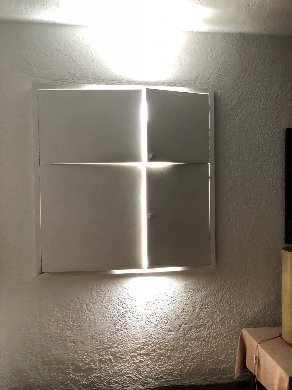寝室の木製の4枚窓は閉めると十字の光のスリットが出来るようになっていました。安藤忠雄の光の教会は完全なパクリです。