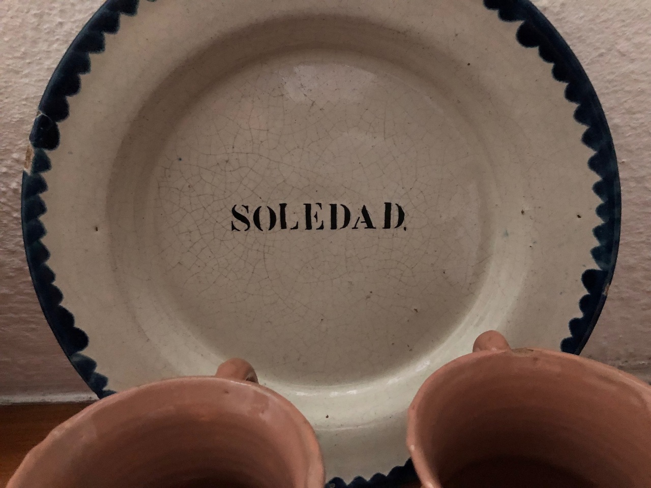 正四角形のシンプルな食卓が置かれた狭い食堂にはたった2脚の椅子が置かれていました。飾り棚に置かれた皿には「SOLEDAD」(孤独)と書かれていました。