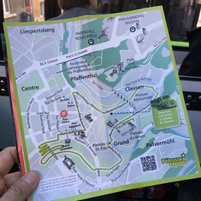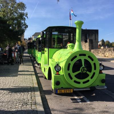 写真のような遊園地の蒸気機関車のような緑色のバスでルクセンブルクの市内の主要スポットを45分で遊覧する事が出来ます。乗車券は大人13ユーロ(カード支払可)シニアはありませんでした。15歳以下は8ユーロ、3歳以下は無料です。10人くらい乗れる個室が連結していますからファミリー単位でも楽しめそうです。乗車は「ボックの砲台」のそばの橋の脇です。45分でここに戻って来て下車します。車内にはオーディオガイドがあり無料で配布されるイヤホンで聴く事が出来ますが、日本語はありませんでした。