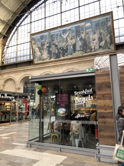 奥の並んだプラットフォームの手前にはコーヒー、軽食の店が並んでいます。