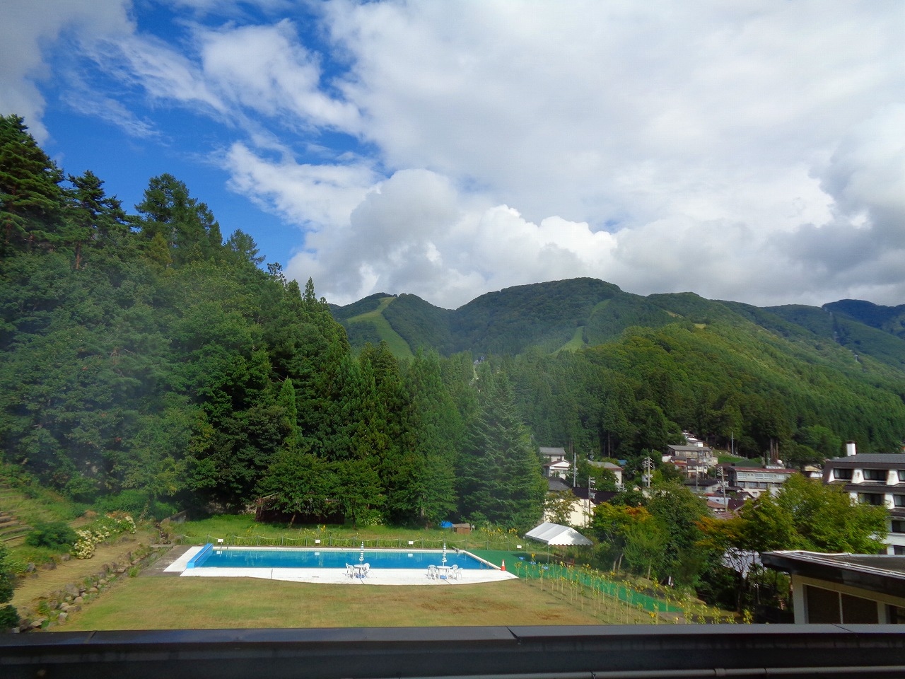 眺望は温泉街を眺めながら手前にはホテルのプールもあります。