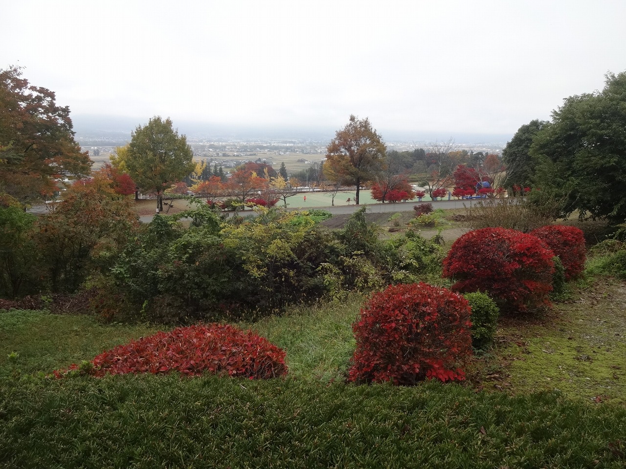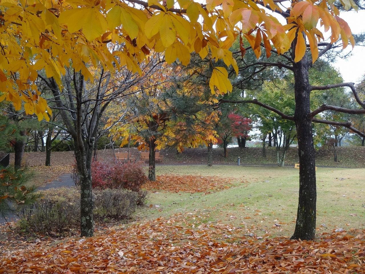 さて、この公園も紅葉は見事で、赤、黄、緑の三役そろい踏み。