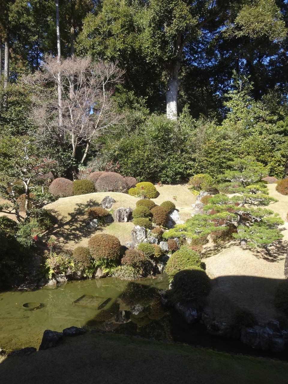 この庭も近景は石を多く配し、後ろほど石を減らして、この書院あるいは書院外のこの廊下からの遠近感を演出しているそうです。