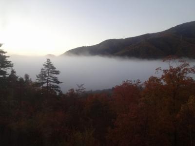 朝から霧模様の中幻想的な木々の下を歩きます。