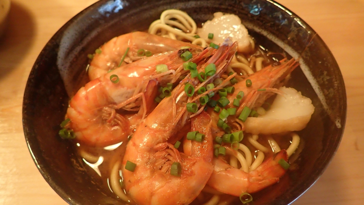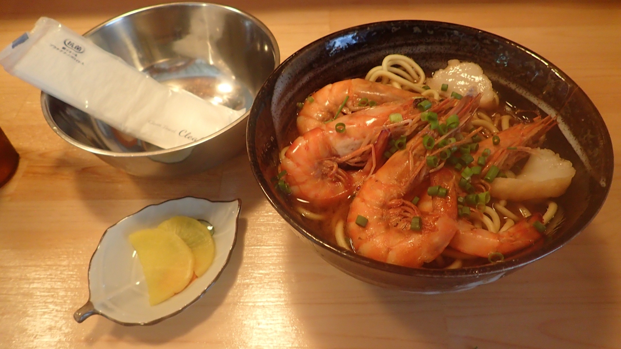 ランチに行きました。夜は居酒屋になる様です。多くのお客さんが車エビそば1,500円税込をオーダーしてました。車エビは、中サイズ2匹とやや小ぶりのサイズ2匹合計4匹入っていて頭付で提供されます。この為、大きなお手拭きと殻入れも提供されます。近くに車エビの養殖場があり、そこから仕入れているそうです。汁は珍しく味噌が入っています。
