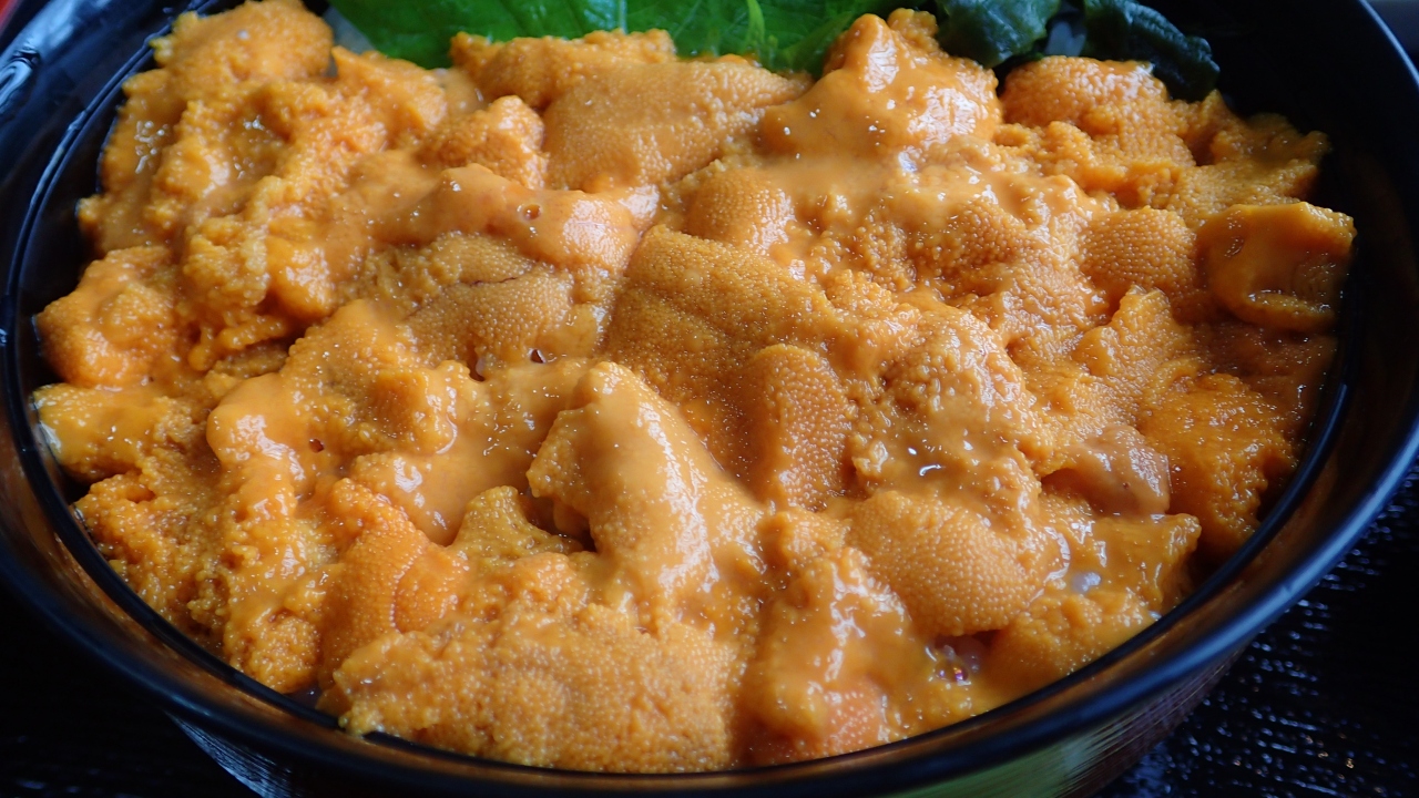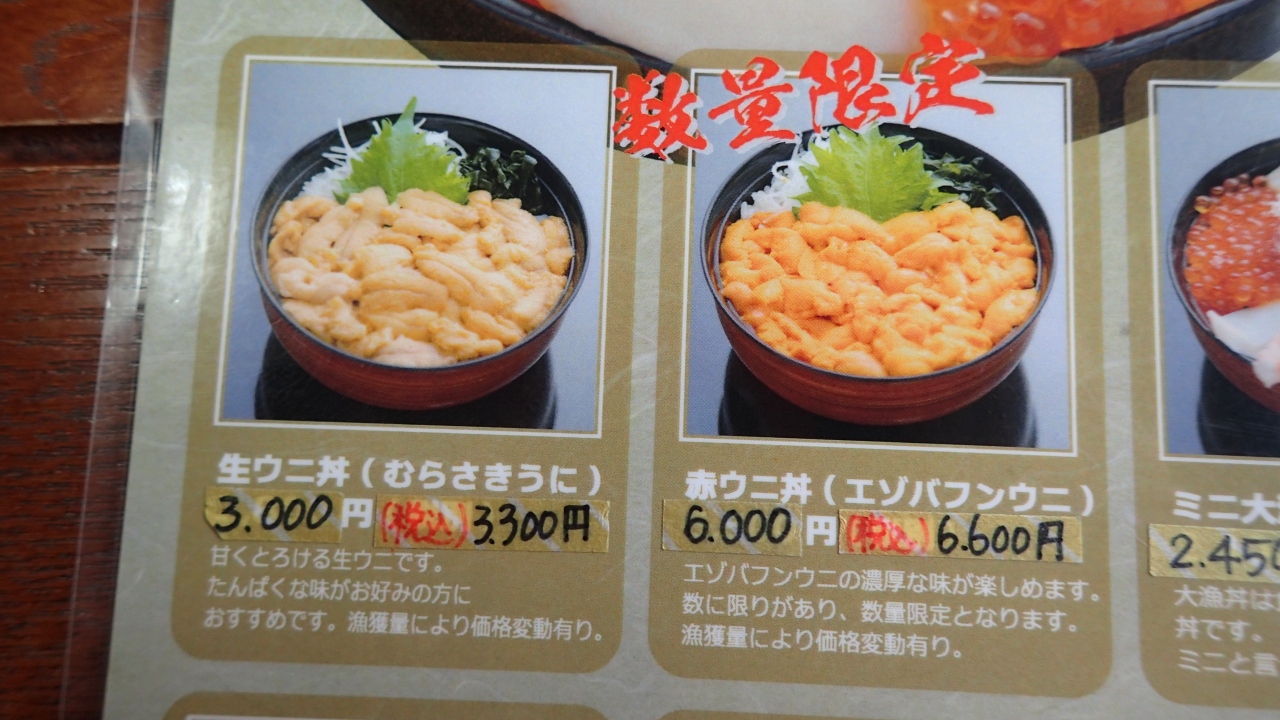 駐車場はほぼ満車でした。行列無く席に着く事ができました。積丹はウニが名物でさらに夏の時期限定、生ウニ丼(ムラサキウニ)3,300円に対して、赤ウニ丼(エゾバフンウニ)6,600円があり、同じ丼でも倍金額が違う。赤ウニ丼の方が苦みがなく美味しいみたいですが、多くの方が赤ウニ丼を食べられるとお聞きして、奮発し赤ウニにしました。