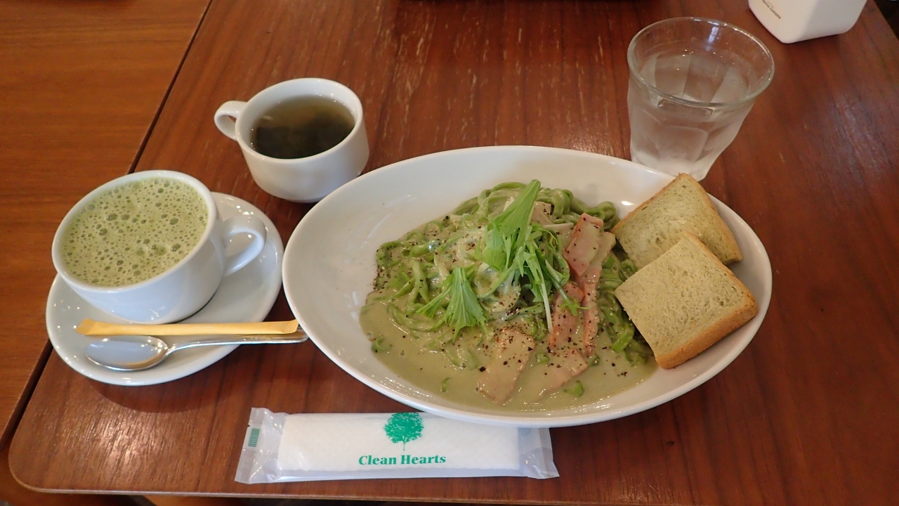 イシガキ ユーグレナガーデンユーグレナたっぷりのカルボナーラとユーグレナソイラテ セットのランチ1200円税別