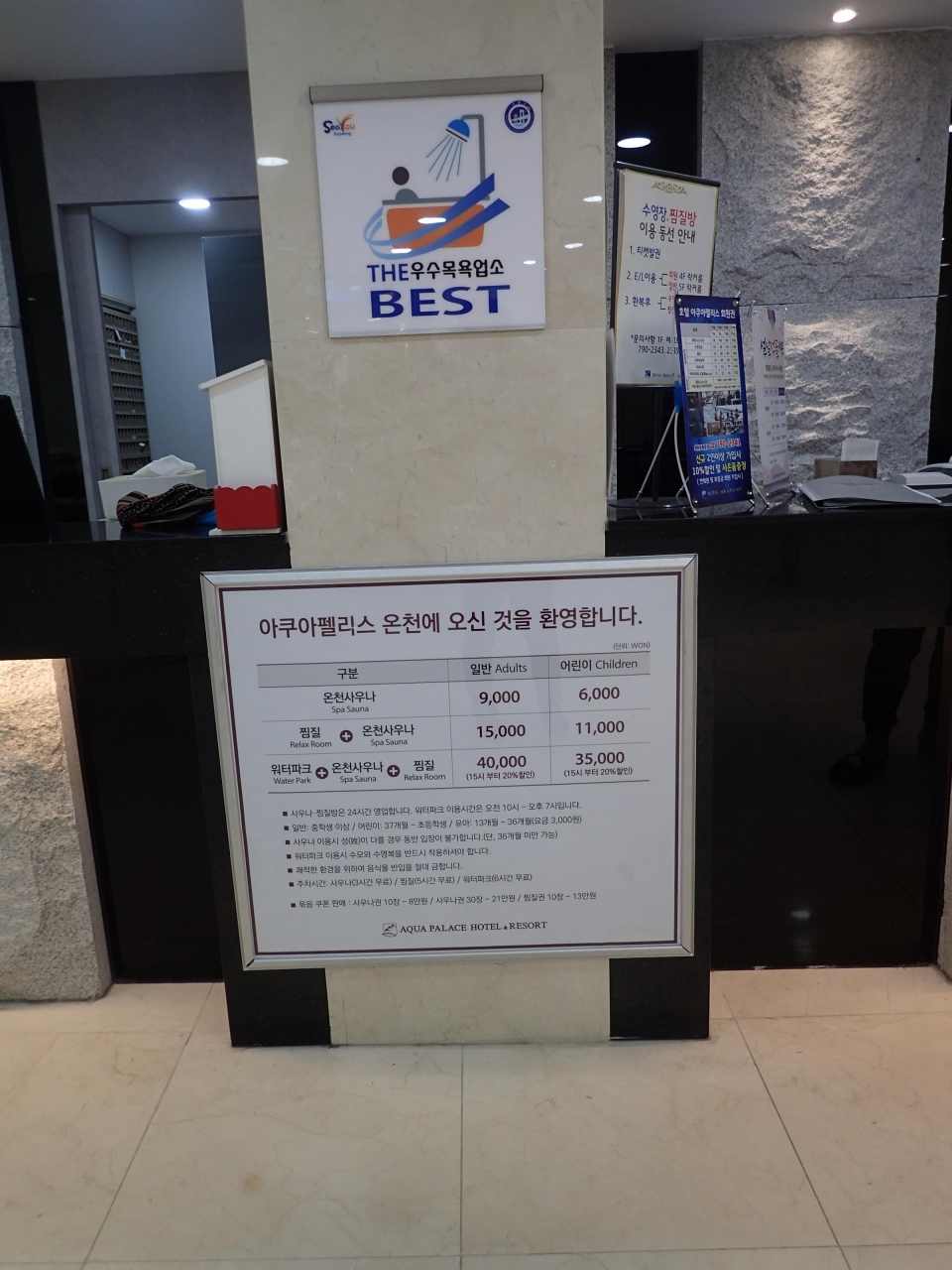 ホテル1階の奥にチムジルバンの受付カウンターがあります。温泉へスパサウナのみで9000ウォン(約833円)でした。専用のエレベーターにのり、チムジルバンフロアに向かいます。湯船から海を見る事ができ、さらに広くて快適です。温泉は38度や41度や43度の湯船があり、気分に応じて入れば良いと思います。