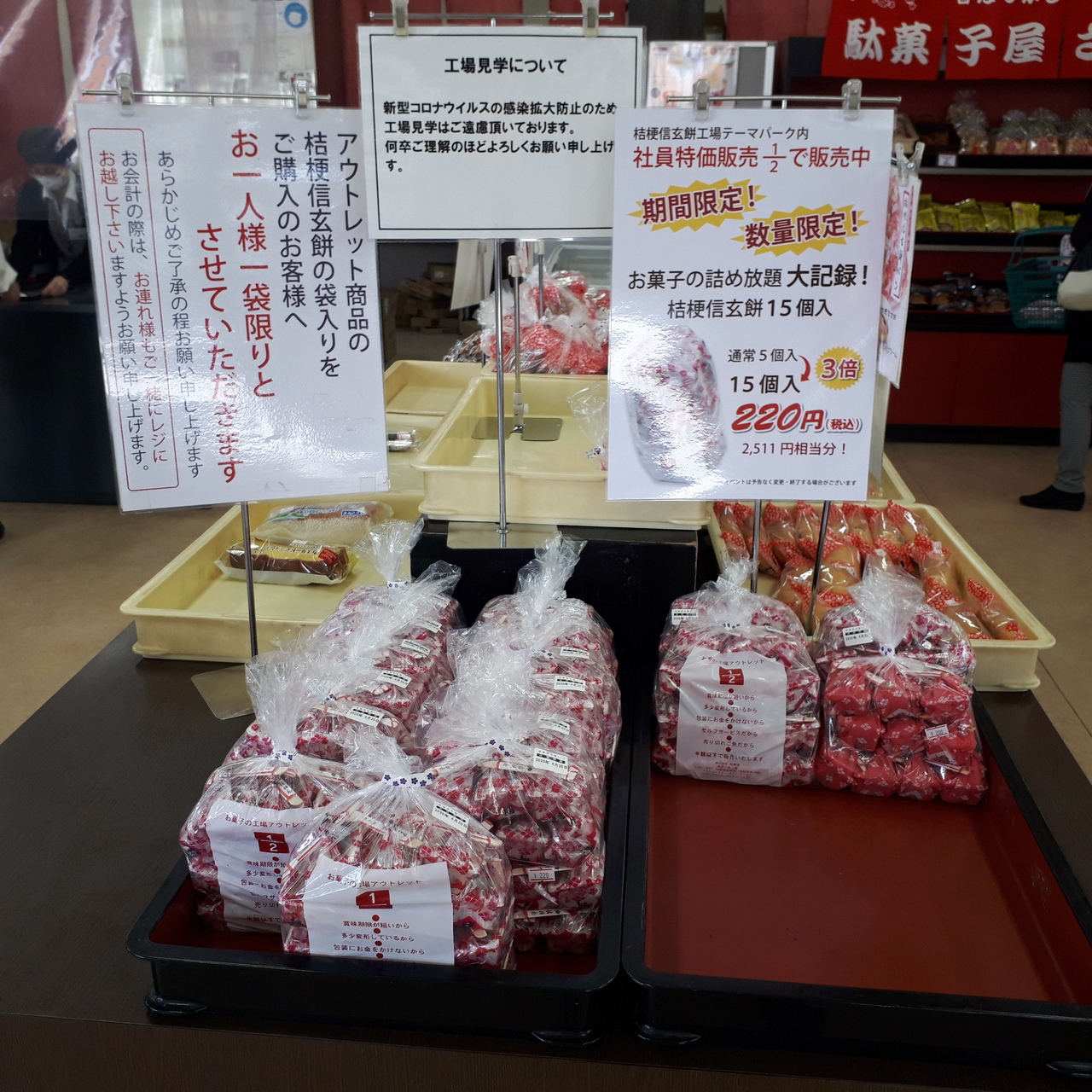 4月下旬に訪問しました、コロナウィルスの関係でお菓子の詰め放題・工場見学・包装体験・レストラン等は中止ないし休業してました。
