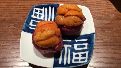 高島屋新館6階の飲食店フロアにあり、品があります。加藤の肉丸と小川のうに丸は、キッチン等は共通の様ですがそれぞれの店舗はわかれており、比較的空いていた加藤の肉丸に入りました。看板メニューの小川と加藤の雅巻きは、ご飯に和牛がまかれ上にはうにがのったお寿司で、お肉とうにを同時に食べるのは初めての経験でした。2,400円税別、日本酒の種類が豊富です。