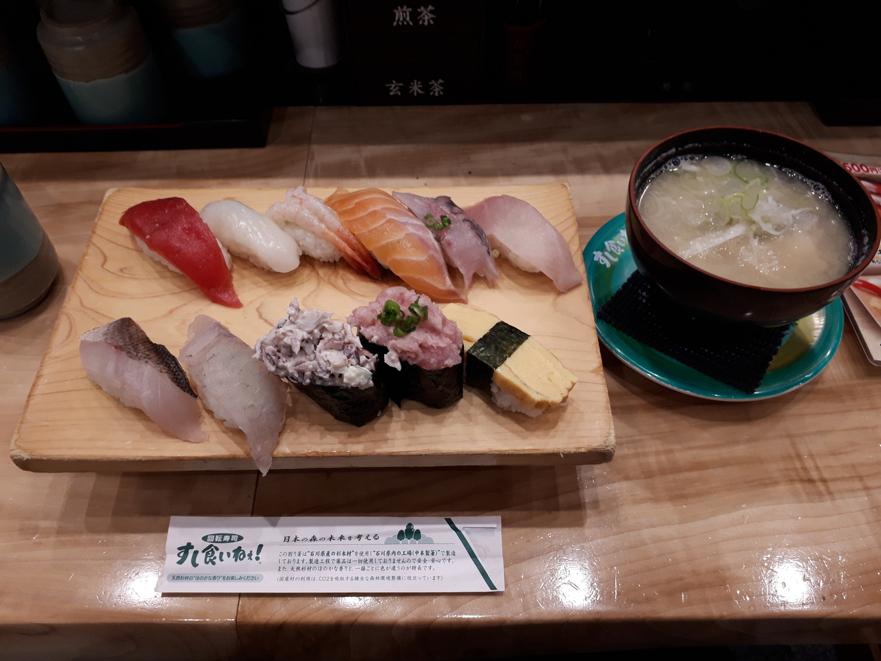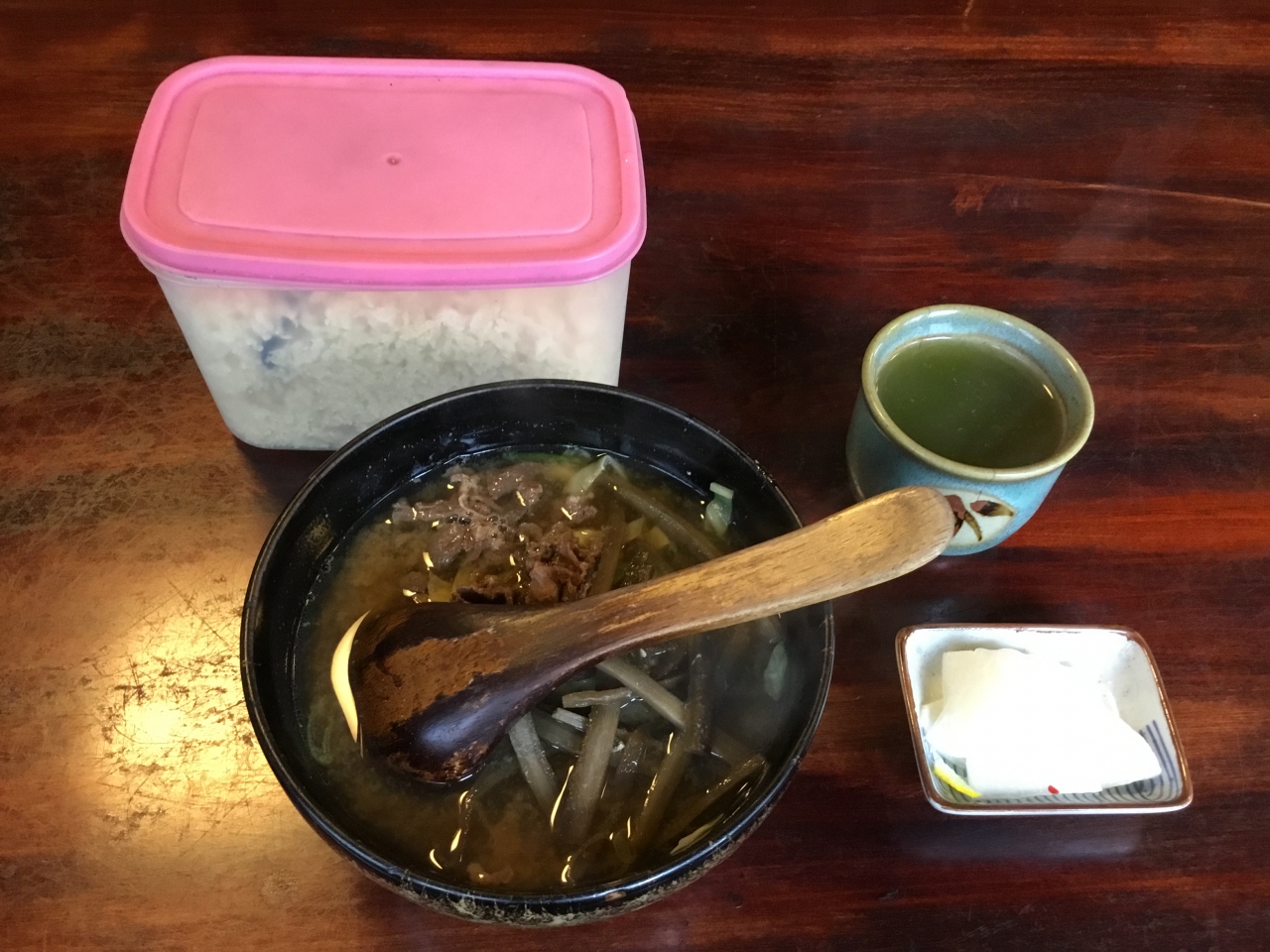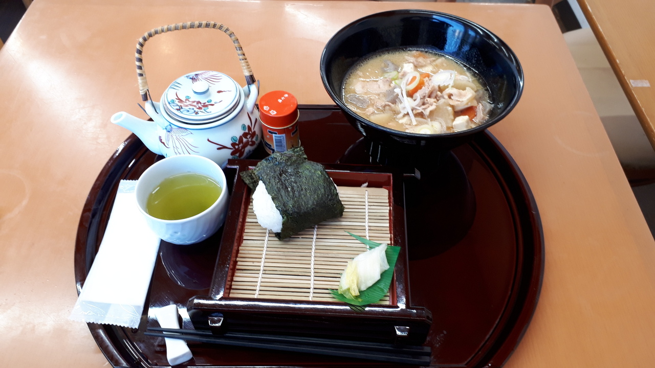 6種類のおむすびから選べられ、野菜たっぷりの豚汁と急須に入ったたっぷりのお茶が