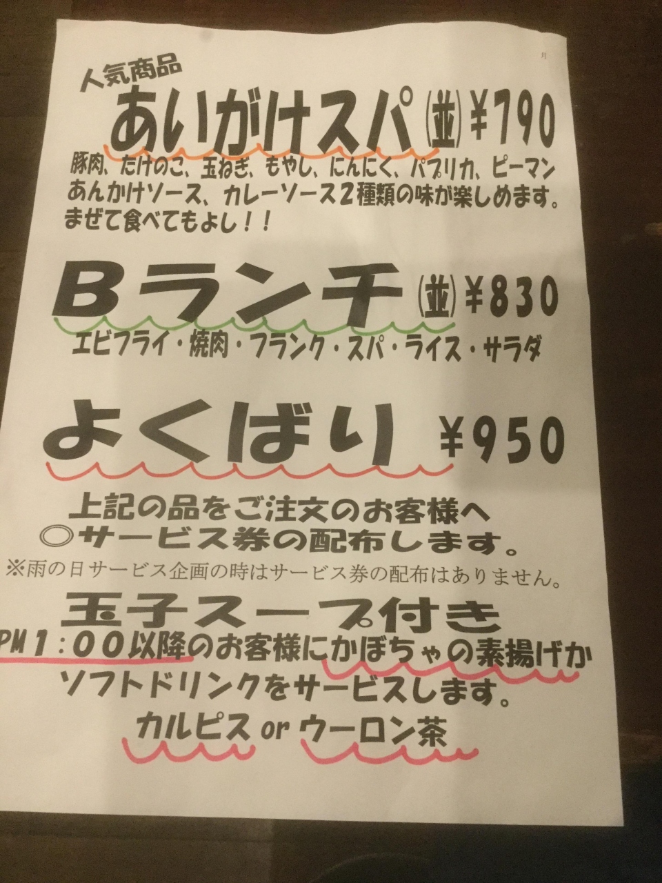 メニューは、平日と週末とで価格が違う様でした、全般的に安くお財布に優しいです。