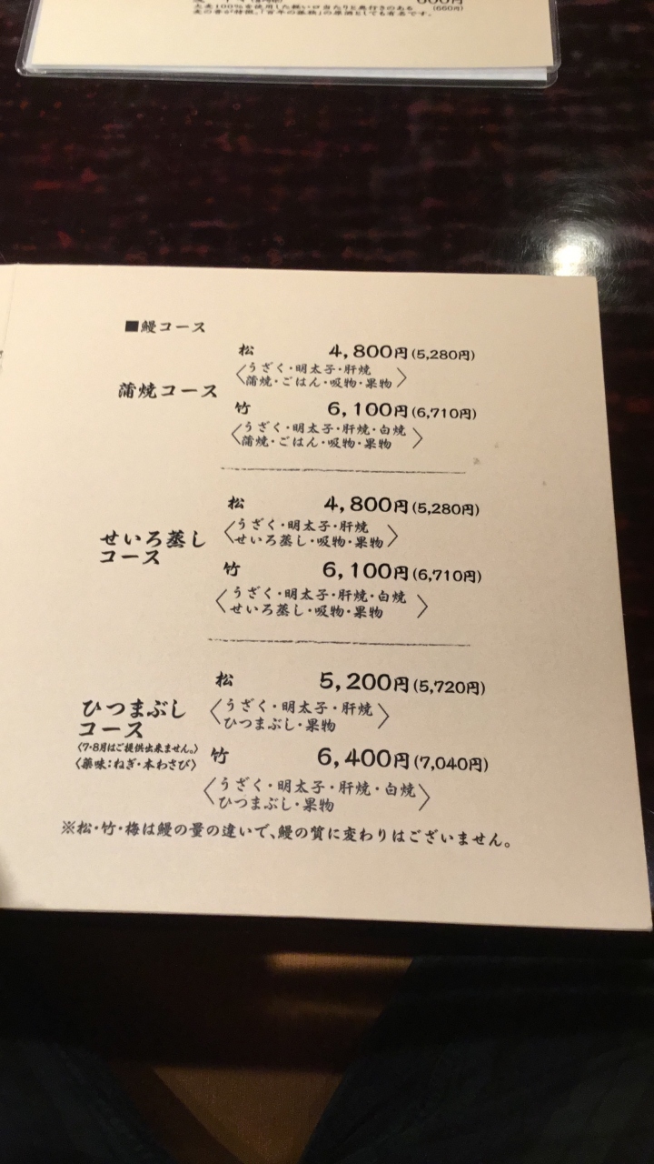 鰻重 ひつまぶし 白焼 せいろ蒸し等あり、店員さんに来たり悩みましたが、せいろ蒸しにして、せっかくだからせいろ蒸しコース 竹 6710円税込 にしました。