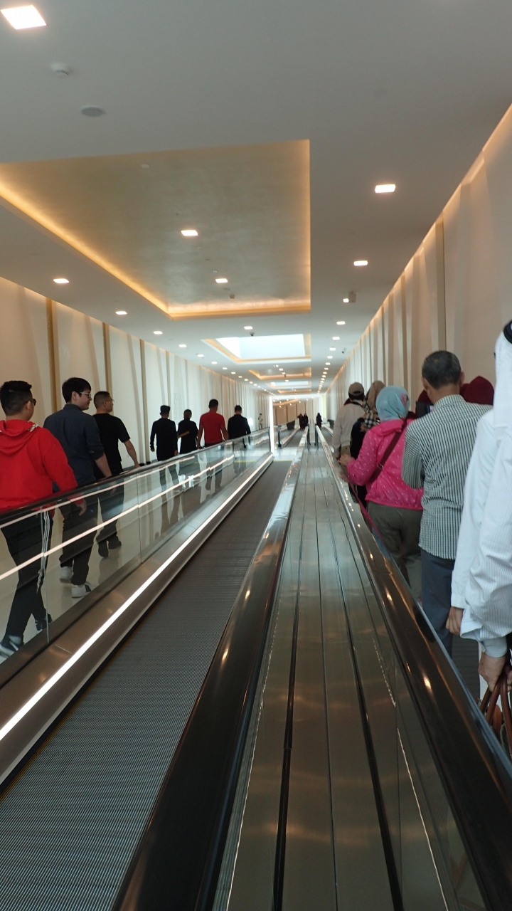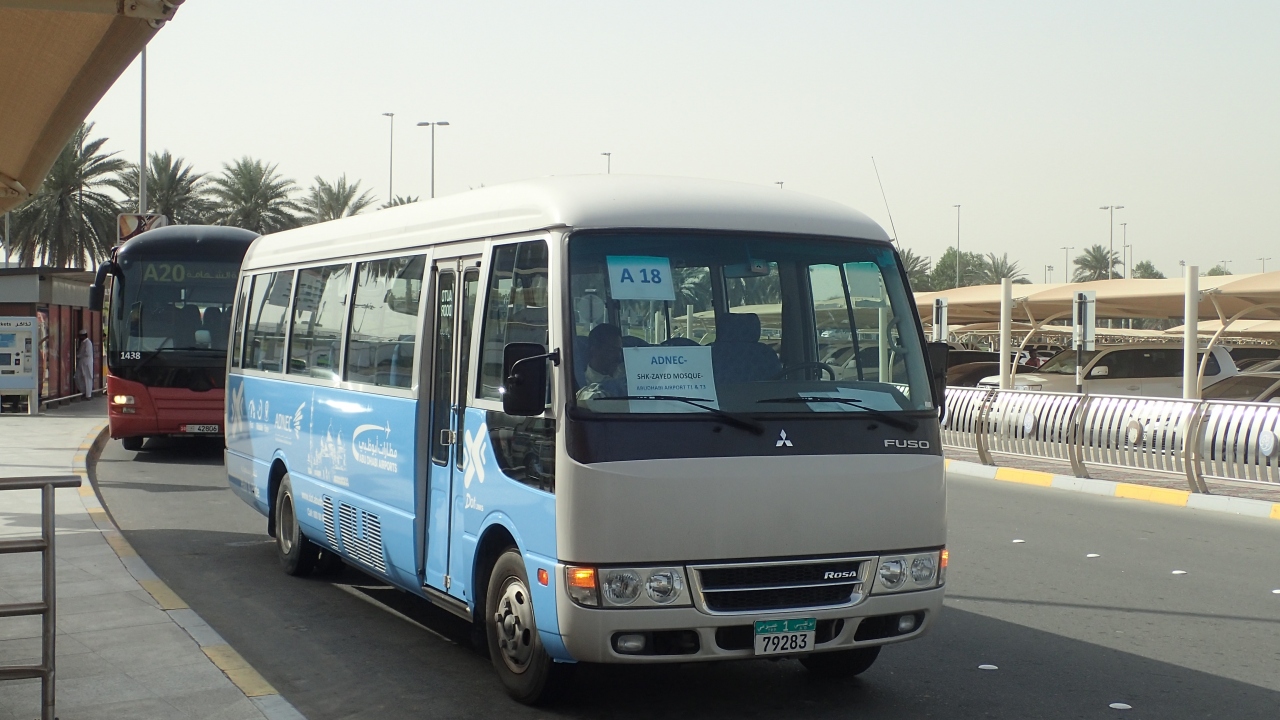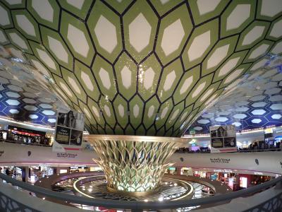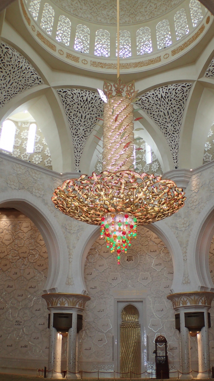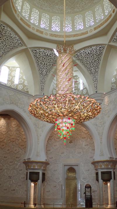 アブダビ国際空港で次のフライトまで14時間あり一日フリーでした。空港からシェイク ザィード グランド モスク行の無料バスが1時間に1本程度出ていて、このA18バスに乗り行きました。直ぐモスクがある場所へ行き見学できる訳でなく、少し離れた場所で地下に入る場所がありそこで手続きして入場します。警備員が多数いて厳しいセキュリティーチェックを受けます。地下の長い通路をわたりモスクが見学できます。壁の装飾には宝石がふんだんに使われていましてびっくりしました。