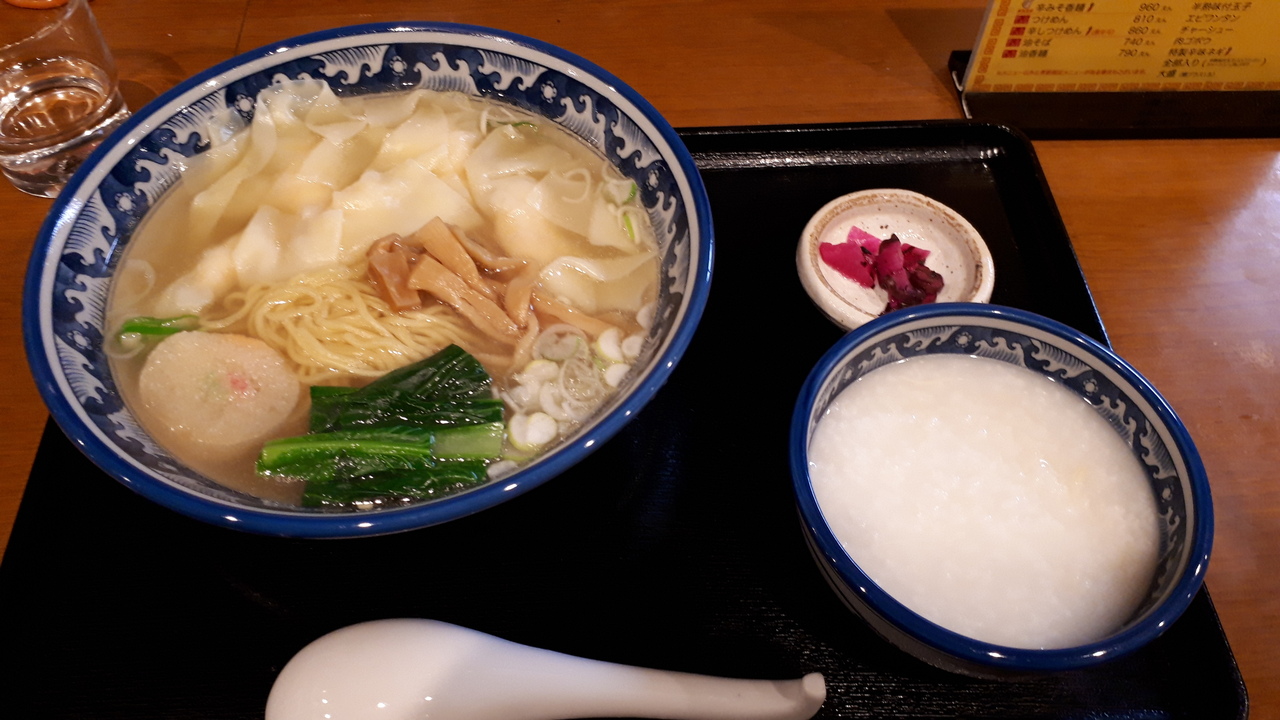 今回は、麺と粥のセットメニュー エビワンタン麺+中華粥(小)セット 1090円税込を