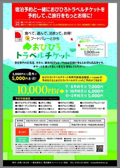 平成28年2月まで帯広空港利用者で北海道以外の地域に住んでいる方々限定で、お得な『帯広トラベルチケット』と言うチケットを1人2冊まで購入できます。1冊1万円分のチケットが平成27年10月までは¥6,000、平成27年11月からは¥5,000で購入できます。私は空港で購入しましたが、ホテルとレンタカーを安く利用が出来、助かりました。- 旅行時期