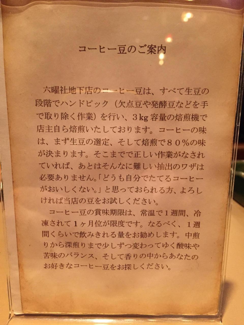 京都には昭和ないい喫茶店がまだいっぱい残っていますがココもそんなお店の一つ。 やっぱり美味しい珈琲店は少量自家焙煎、それがそのお店の味を作るし、そのお店のセンスに惚れる。最近はハンドドリップを売りにするチェーン店もあるがそもそも味を決めるのは焙煎でしょって意味ではそんな珈琲文化を楽しめるお店。