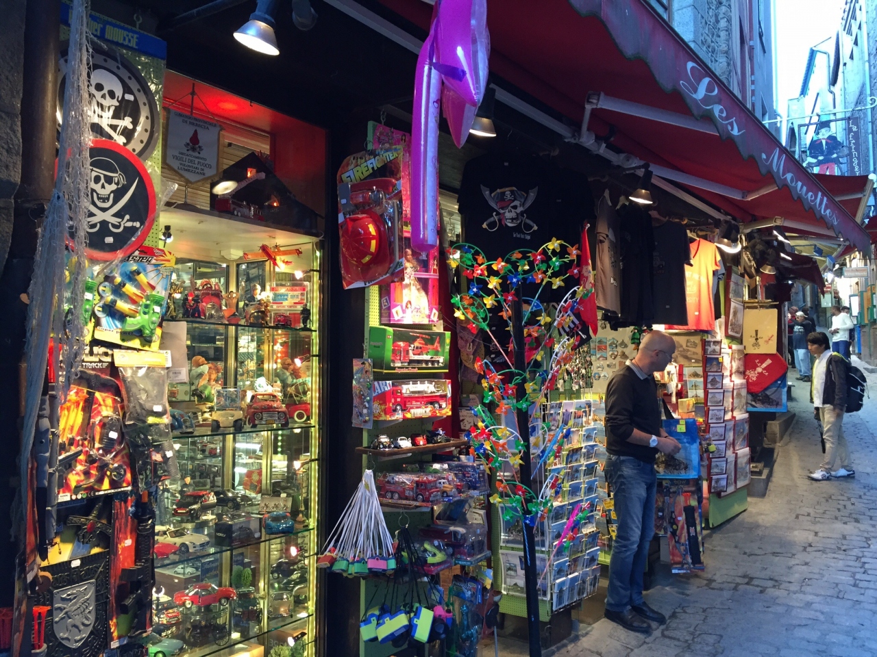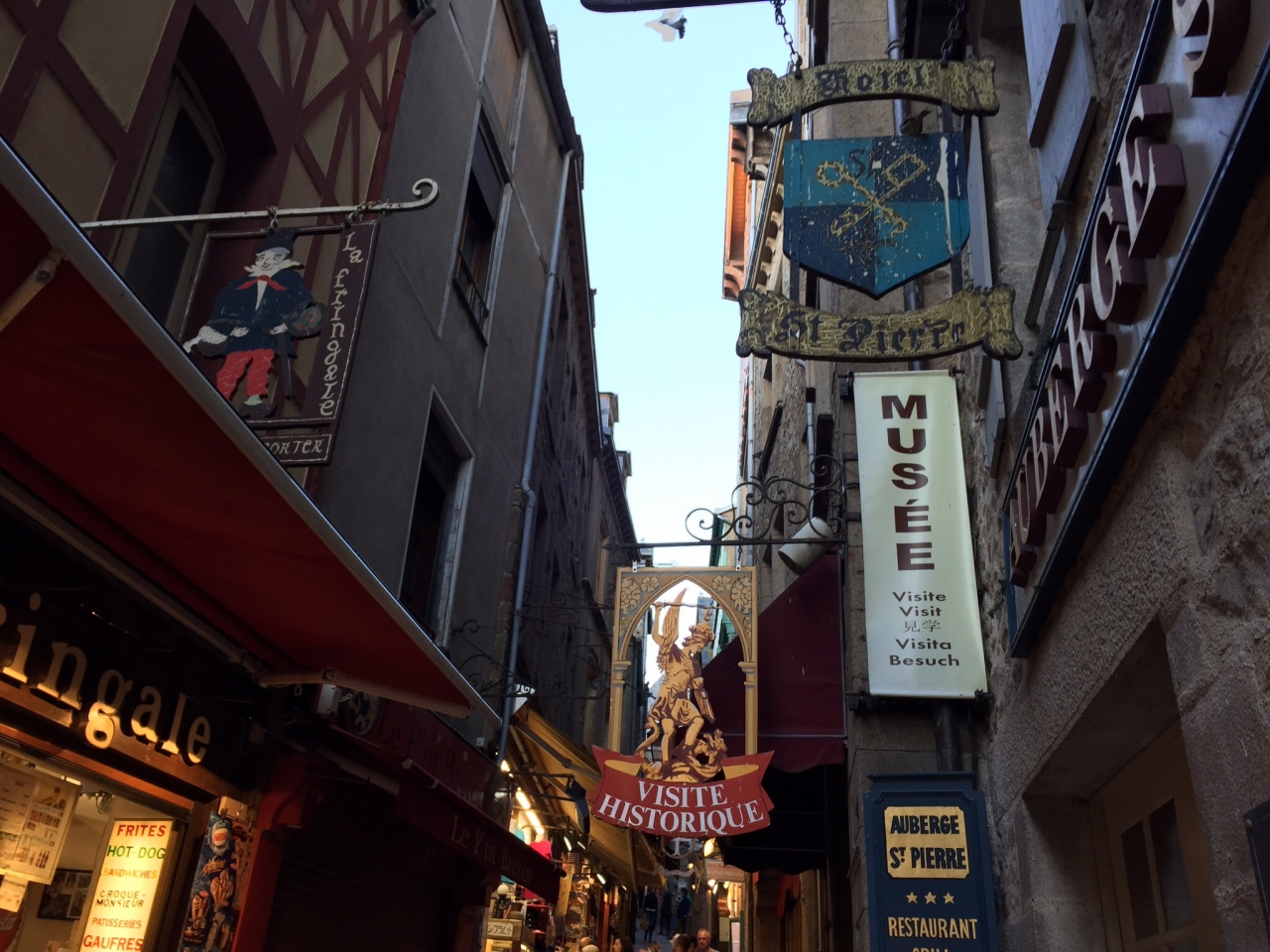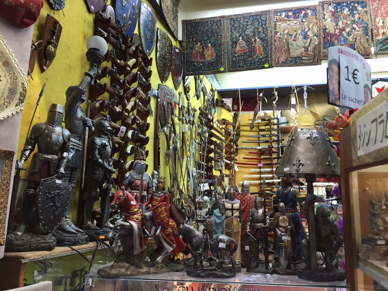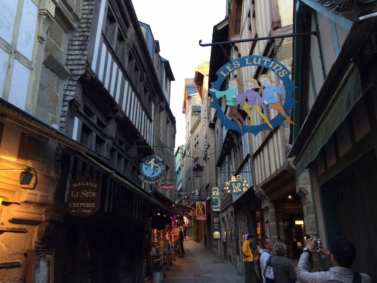 モンサンミッシェルのグランド リュは、お土産物屋さんは自分的には江の島的だなぁって思っちゃうけど大好きです!なんで剣とか刀とか売りたがるかなぁ、日本刀売ってる店もあって訳分からないカオス状態が面白い。 とか言いつつ自分もミカエル様の像を買ってしまいました。