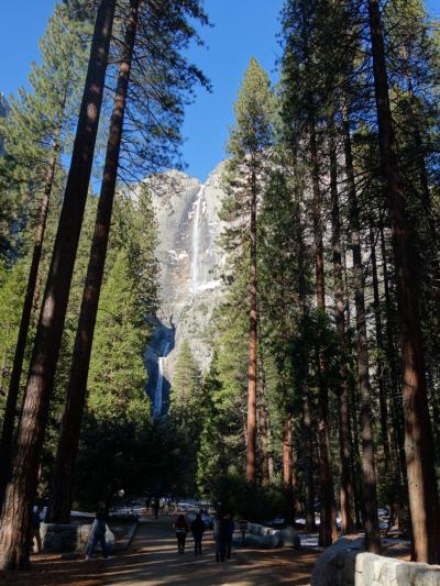 ヨセミテフォールもヨセミテ国立公園を代表する景観、ヨセミテフォールは色んな表情が楽しめます。遠くから見ると滝は一段しか見えないけど近くに行くと二段目、三段目が見えます。ビジターセンターから近いので歩いて近くまで行く人が沢山います。