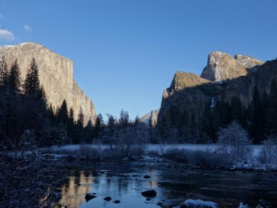 エルキャピタン!真ん中にハートが見える。やっぱり有名スポットなので車がいっぱい止まってました、でもこの日は寒くてエルキャピタンの前には雪景色が広がってました、そして振り返るとブライダルベールは凍ってる~、奥様はこの滝に豪快に水が流れているのが見たかったらしいんですが調査不足でした。。。
