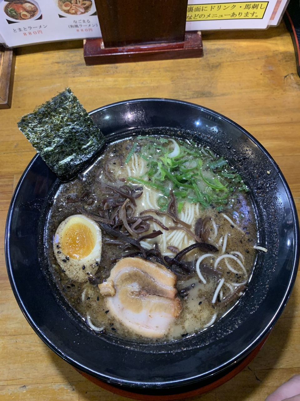 初めてだったので、メニューの一番上にある「バリ黒豚骨ラーメン790円」の「半やきめし+350円」セットを注文しました。