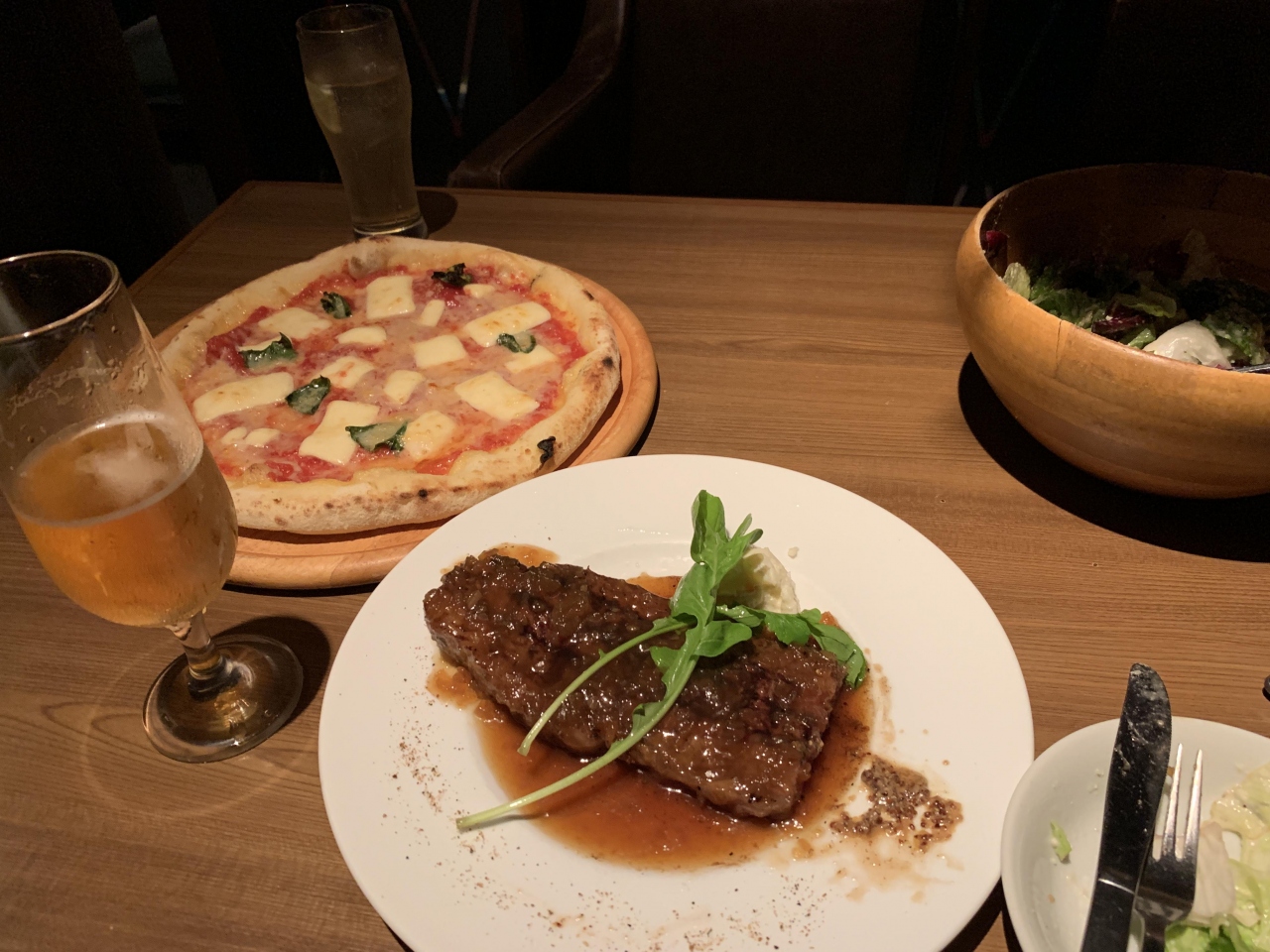 サーロインステーキが絶品でした。ピザもいろいろな種類があり、マルゲリータも美味しかったです。生ハムサラダもボリューム満点でした。