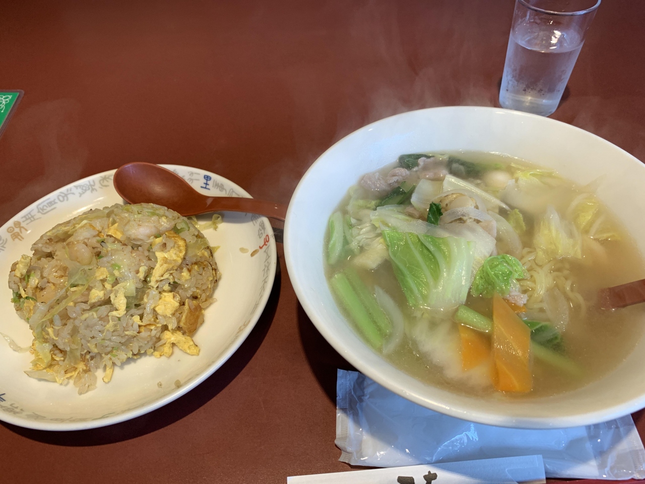 五目麺とえびチャーハンと餃子、食後に杏仁豆腐を頂きました。