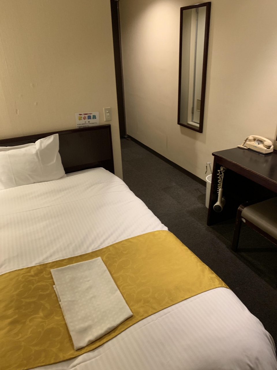 部屋は普通のビジネスホテルと言った感じ。シャワーがやや勢いが弱いわりに穴が細かくてやや痛いのが少し残念なところですが、立地とコスパもいいので、利用価値はありと思います。- 旅行時期